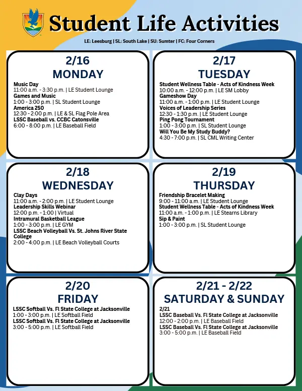 At Lake-Sumter State College, your college experience goes beyond the classroom. Our vibrant student life is designed to help you connect, grow, and make the most of your time on campus. Whether you’re joining a club, cheering on the Lakehawks, hitting the gym, or getting involved in student government, there’s a place here for you.